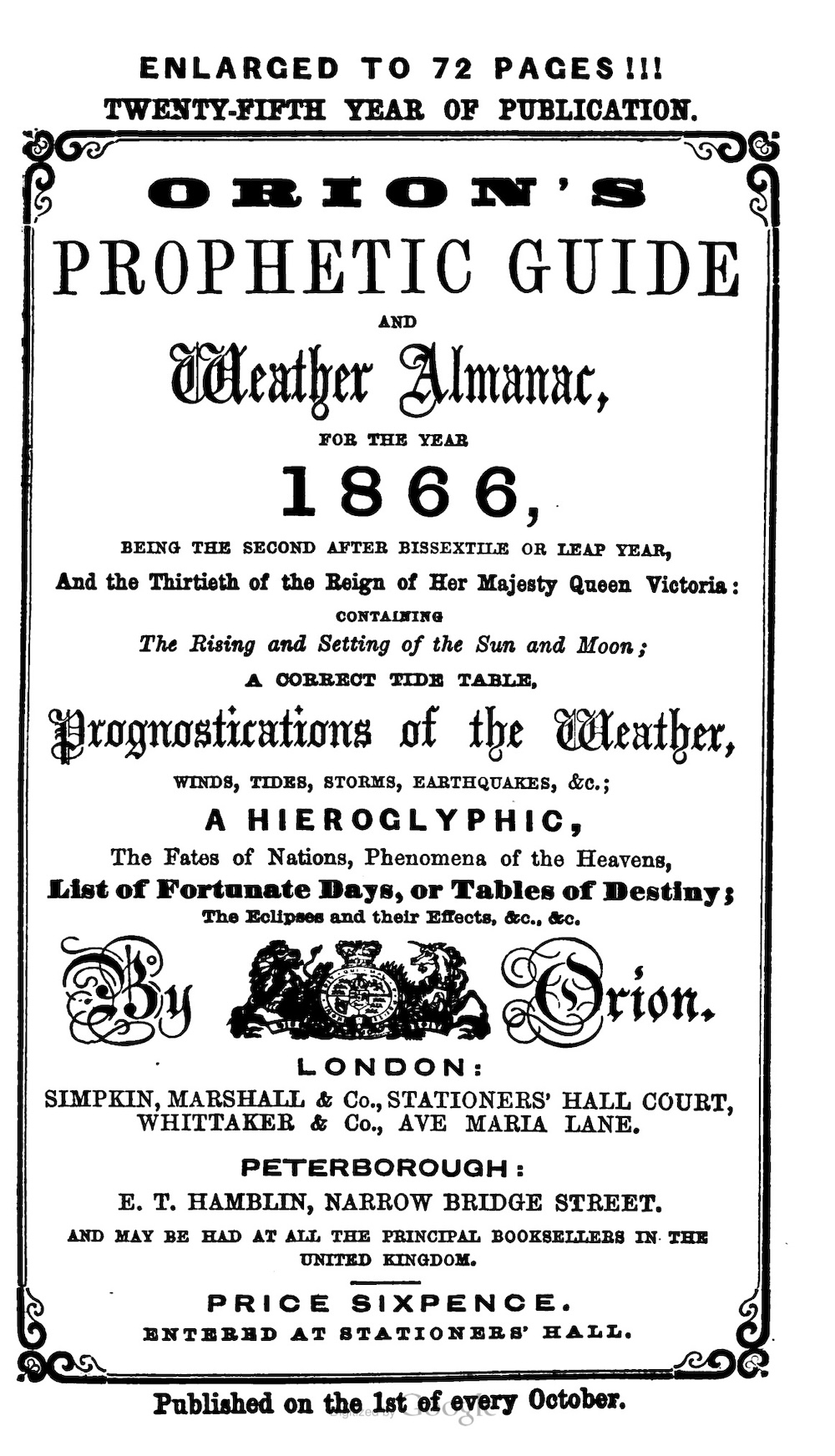 Orion's Prophetic Almanac, Weather Guide and Ephemeris. This was a standard almanac of the period with phases of the moon, lists of fortunate days derived from appropriate astrological signs, tables of the rising and setting of the sun, planting times, tide tables, prognostications of the weather, snippets of curious history, notable historical events by date, prophetic observations, predictions of storms, winds and earthquakes and an annual symbolic Hieroglyphic plate of the Fates of Nations for the coming year (the meaning of whose glyphs was explained in the following year's almanac), all of which was glossed with popular astrology of the sort that later would later grace newspaper astrological columns. In the 1870s the journal added an ephemeris to its annual offerings. The almanac also offered "The Oracle of Delphos" or "Universal Oracle of Pastime and Amusement" that would provide a correct answer to any question by counting the letters in the questioner's name and the subject of the question adding a secret number for the day of the week and for the ruling planet, divide by 27 and compare the last resulting digit with a list of fortunate and unfortunate numbers. Orion was John Hammerton of Peterborough (d. 1887), who is regularly listed as the person to whom to remit payments, questions and subscriptions and whose wife Mrs. M.P. Hammerton (Mary Picard Hammerton, 1823-1880) is credited with the compounding of "Orion's Astro-Botanic Compounds"-- solar pills (ensures regularity of the bowels), lunar pills ("a domestic medicine for Females of all ages and periods of life"), pulmonic pills (allays the irritation which provokes coughing), all 1s. 1 1/2d. a box. Orion also offered astrological prognostications, including nativities for 5s. (7s. 6d. if they included "Judgment on Marriage"). Hammerton is listed in the 1881 census as "Author of Orion's Almanac." NYPL; BL; Oxford University.