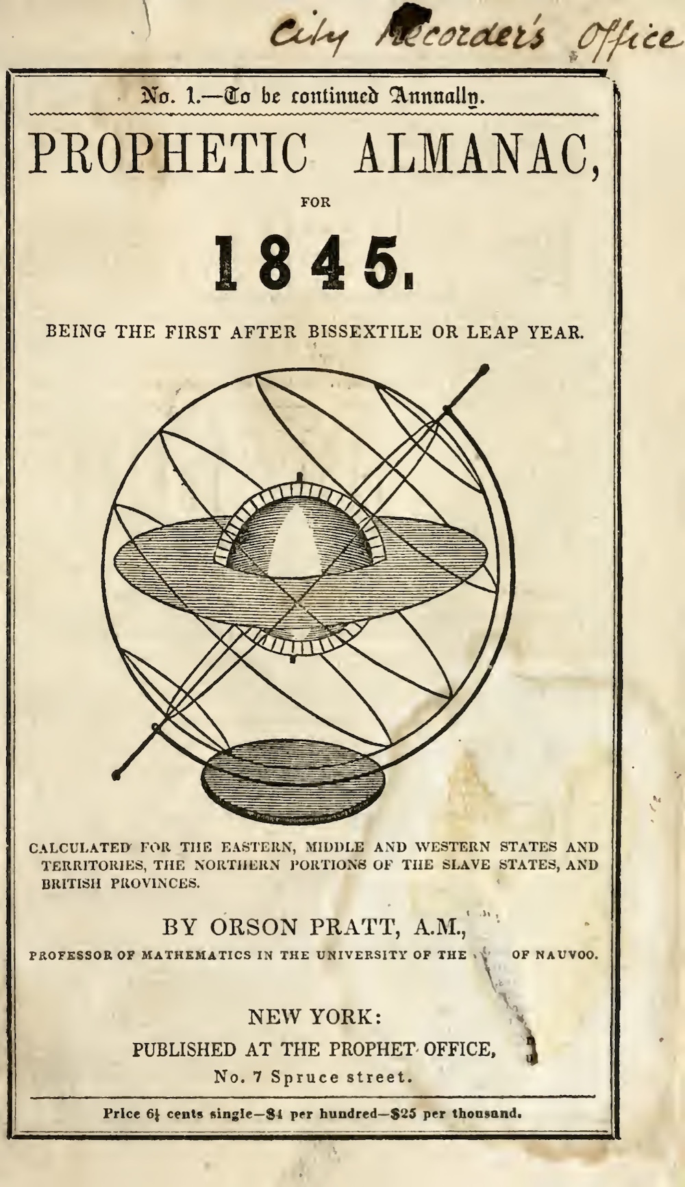Prophetic Almanac for [1845], The. Pratt (1811-1881) was an original member of the Quorum of the Twelve Apostles of the Church of Latter Day Saints, and a mathematician. The almanac was a standard compilation of notably dates for the western, central and eastern United States, with dates for eclipses, moon phases, anniversaries of the deaths of notable persons, combined with Orson's discussions of the outrages in Missouri perpetrated on the Mormons, regular paragraphs on "The Doctrine of Christ," arguments over the "false doctrines of the nineteenth century," and the like. On Pratt, see the note under The Seer.