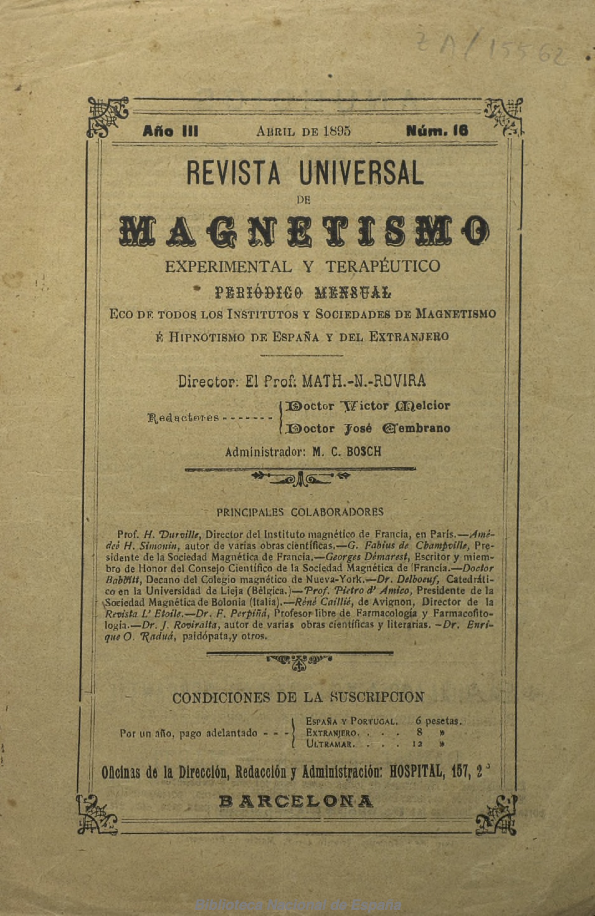 Revista Universal de Magnetismo Experimental y Terapeutico. This journal proclaimed itself the "echo" of other contemporary journals devoted to the subject, but it was really little more than an uncommented-upon reprint of long excerpts (often unattributed) from other sources. The only surviving issue (April 1895) reprinted a long letter of Alfred Russel Wallace to the Times on the scientific approach to spiritualism and how he became involved with it, and a piece of an article or book by Gabriel Delanne, without naming him, on "El Espiritismo Ante La Cienza" that it took from El Sol. The "principal collaborators" of the journal were notable: H. Durville, G. Fabius de Champville, Georges Demarest, E.D. Babbitt, Rene Caillie, J. Roviralta, et al., but their role in the venture can not be determined. The journal did print impressive advertisements for Durville's treatments and magnetic accoutrements and for the "Vivicador del Cabello, Bouquet Magno-Vitalizato," a few drops of which, for 3 pesetas, could cure baldness, and these advertisements may have been the rationale behind the journal's existence. Earlier issues may have been more interesting since literature reviews mention a Russian scientist's discovery of how to photograph magnetism, and the use of magnetism to discover the perpetrators of crimes, but by 1895 the journal consisted mainly of filler. The director of the journal, Dr. Math.-N.-Rovira, as he gave his name, is unknown, except for his having founded the Instituto Magnetico Franco-Espanol. A letter from him to the editor of Constancia survives in that journal, begging mention in its pages: "Not guided by any other motive than to spread everywhere a science as transcendental as hypno-magneticism is, and for the love of the same good, we would see with great pleasure the insertion of some mention of it or of one of its articles in the columns of your worthy newspaper." BNE. Noted in exchanges of Ubersinnliche Welt, 1893.