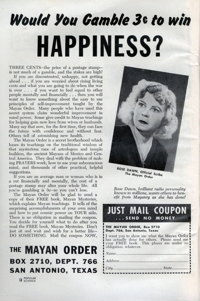 No one did them better or more successfully than Rose Dawn and Koran in these Mayan Order Lessons. As John B. Buescher has learnedly and entertainingly documented in his forthcoming Radio Minds: Clairvoyants on the Air in Early Broadcasting (McFarland & Co., 2020), William Perry Taylor (1897-1953), who toured the vaudeville circuits as the clairvoyant "Prince Rajbar Mahendra" and "Koran the Mystic," and Isabelle Madge Coutant Kruschke Mullens [Taylor (?)] (1897-1964), a showgirl and singer who called herself "Rose Dawn" or "Rose Dawn the Star Girl," came together while appearing on John R. Brinkley's XER/XERA border-radio station across from Del Rio, Texas, in the mid-1930s. They were a whirlwind of creative commercialism, offering psychic readings, astrological advice, instructions in fortunetelling, books on making one's personality blossom like a flower, magic vials of exotic perfume, and a "Rose Dawn Giant Daily Astrological Guide," complete with a "Good Luck Affirmation," as well as publishing Rose Dawn's Modern Astrology and, from 1937, her Daily Meditation. In 1935-1936, Koran and Rose Dawn branched into "Mayanry" (as they called it), although neither had any discernable connection with anything Mayan -- other than a familiarity with Augustus Le Plongeon's works and a brief visit to President Cárdenas in Mexico City in 1936 with a tourist visit to the Aztec ruins there. People were introduced to the Order by the offer of a "free" book (Revelation Secret, below) sent for a dollar that promised to reveal the secret "easy to use principles of self-improvement taught by the Mayan Order," the precepts of which led to confidence, health, a guaranteed increase in income, and general success, all "based upon" "the traditional wisdom of that mysterious race of astrologers and temple builders." No explanation was offered about where the Order had come upon this traditional wisdom and no claim was made that the largely anonymous leaders had been initiated into the Mayan Mysteries by some surviving Mayans or existing secret group. The offer was advertised nationwide in popular magazines ("Would you Gamble 3 cents to win Happiness" -- a line Charles Atlas had pioneered earlier to entice people to his body-building lessons: "Would You Gamble 2 cents to Win a Body Like Mine?") -- and on Rose and Koran's radio shows and in Rose's Modern Astrology monthly. Interested inquirers would receive a formal application urging them to ask for admission -- for a $10.00 application fee, and if found worthy, received a certificate of membership (suitable for framing) and agreed to pay monthly dues of $2.50, together with other fees as they advanced through the 10 degrees of the Order.