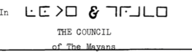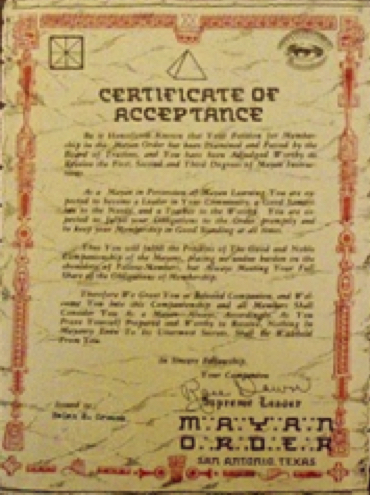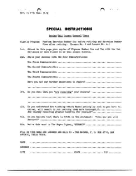 Rose and Koran had obviously learned much from the travails of Brinkley, the "Goat Gland Doctor," in his legal struggles with the federal government. It is hard to prove fraud when the monthly dues only entitled the members to bare membership. Probably for the same reasons, the Order was a black box, almost totally (and deliberately) anonymous and impervious to inquiry or investigation. Rose Dawn appears in the lessons as "Official Scribe" and "P.T. Koran" is once listed as "Grand Master," and Rose ascended to "Supreme Leader" after Koran's death in 1953, but that is all. The lessons are signed by "Your Instructor" or "Your Class Instructor," and it is impossible to say who actually wrote them or what the instructor's relationship might have been to the Mayan Order. Members had no contact with other members and little with the Order beyond their applications and monthly dues, receipt of lessons and passwords by mail (the passwords, sent in pigpen cipher: Lesson 5, to be recited mentally at initiations) and the occasional achievement form to fill out and mail to San Antonio: