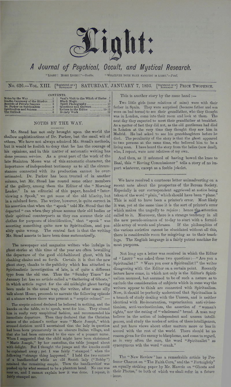Corporate author: British National Association of Spiritualists / Central Association of Spiritualists / London Spiritualist Alliance (1884) / College of Psychic Science / College of Psychic Studies1/1, January 8, 1881-current. Originally 10s 10d a year, 2p a copy, then 13s a year. 8-12 pp. (varies) Founded by Dawson Rogers and W. Stainton Moses after the British National Association of Spiritualists fell into disarray and discord, along with The Spiritualist Newspaper which had been its de facto organ. For a time the small monthly Spiritual Notes served that purpose, and then Rogers and Moses and other like-minded spiritualists started this journal for their wing of the BNAS, the Central Association of Spiritualists. At first it appeared alongside the Spiritualist. The Eclectic Publishing Company which originally published the journal was funded by the sale of 2,000 shares at one pound each. When the journal ran into financial problems in the 1890s it was rescued by Arthur Conan Doyle, who made substantial anonymous gifts (and later edited the journal for a period). This was the preeminent spiritualist journal in England for more than a century, directed, unlike its contemporaries the Medium and Daybreak and The Two Worlds, more to the educated, less avowedly Christian and more urbane classes of London than to working-class or provincial audiences. At various times between its inception and World War I, the circulation of the journal is estimated to have been in the range of 5,000-7,500, though that number is based on extrapolation from donations reported in the journal and the actual number is probably lower. LOC; NYPL; Boston Public Library; University of Illinois; Harvard University; Ohio State University; Brown University; University of Texas, Austin; Stanford University, and other locations.